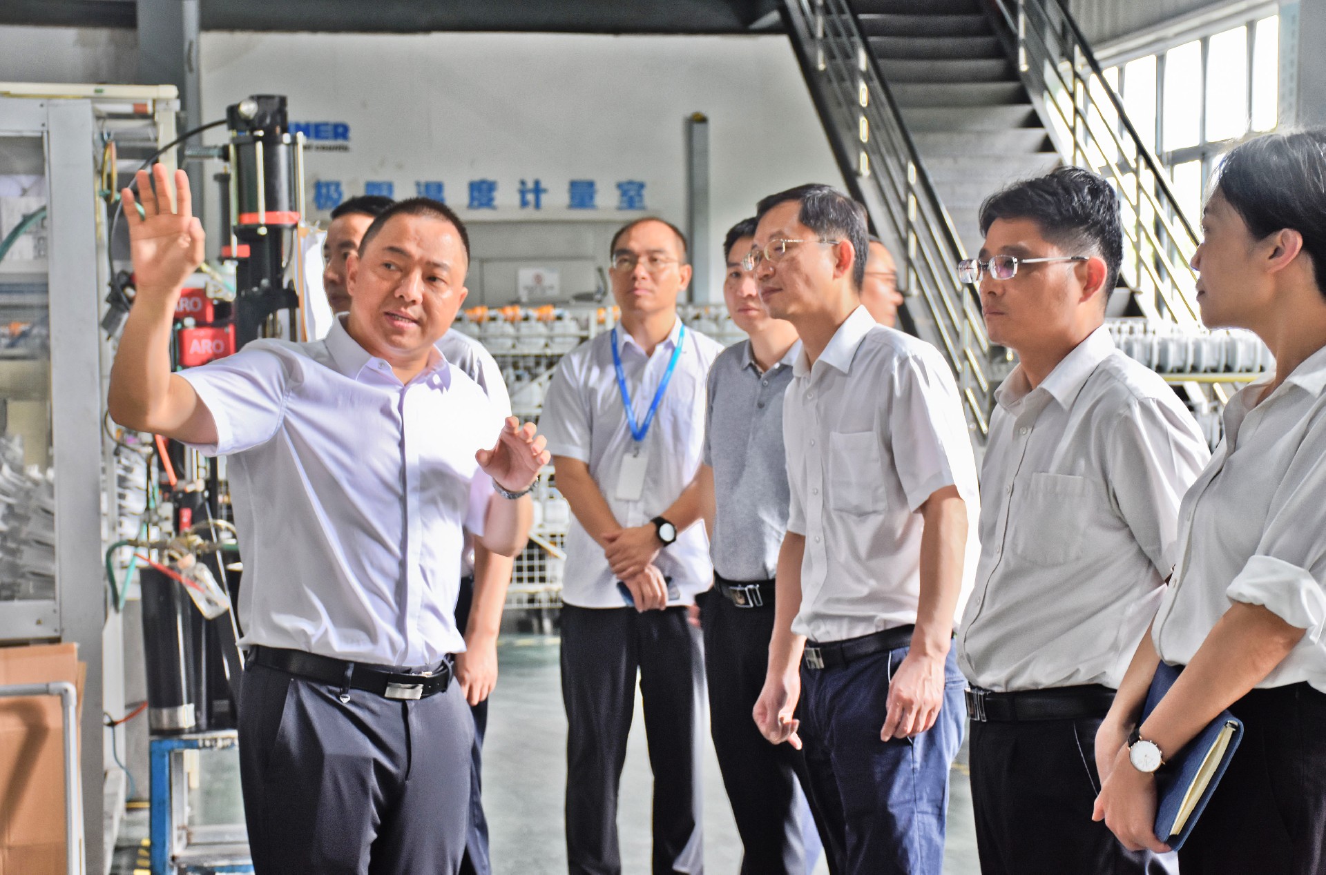 李德宝处长等领导一行先后参观了好博体育产品展厅、智能制造车间及计量检测中心。调研过程中,公司董事长李诗华、常务副总经理任海军分别就公司发展历程、产品研发成果、智能制造过程、计量检测与溯源以及行业市场等方面向领导作了工作汇报。